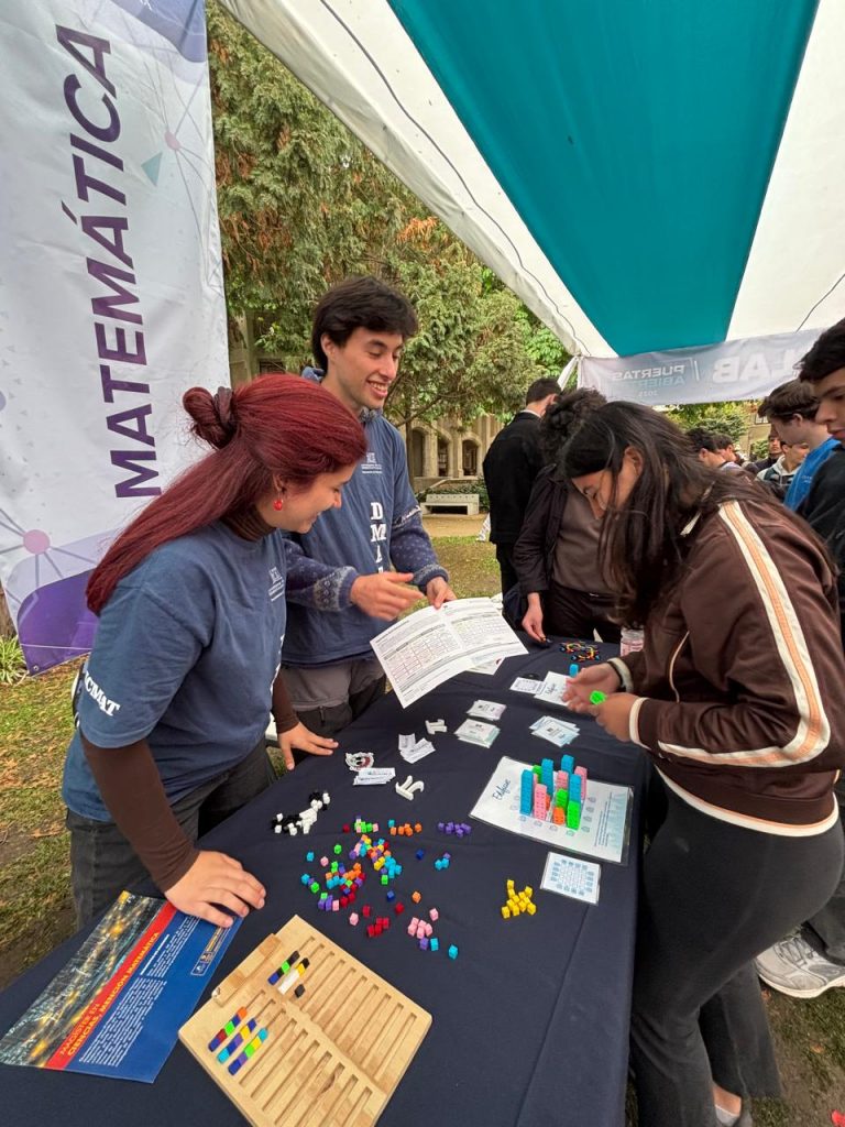 Durante las jornadas, estudiantes, monitores, académicos/as y profesores/as del DMAT ofrecieron actividades, charlas y talleres que acercaron la matemática a futuros postulantes y visitantes, invitándolos a descubrir su aplicación en distintos ámbitos del conocimiento y la ingeniería.